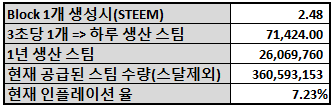 - (내용 정정) STEEMDB 사이트를 조회 해본 결과 현재 Steem의 인플레이션율은 7.98% 라고 나와 있습니다.