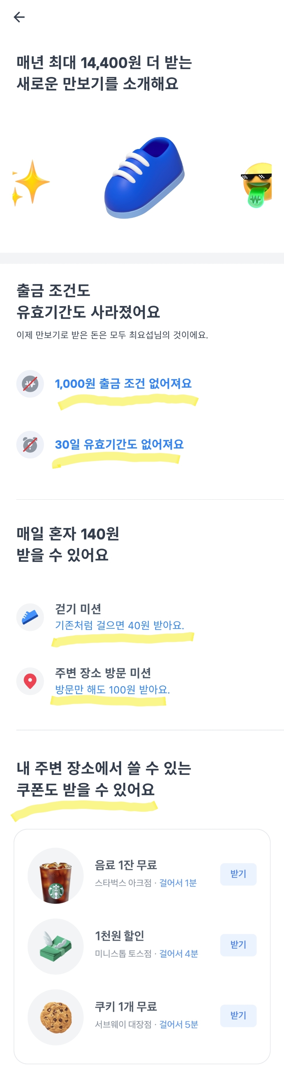 그런데 저처럼 걷지 않고 60원만 꼬박꼬박 받아가는 유저들이 꽤 많은가봅니다. 최근에 토스가 하루에 140원을 받고 주변 브랜드 할인 쿠폰까지 받을 수 있다는 신 만보기 컨텐츠를 공개했습니다.