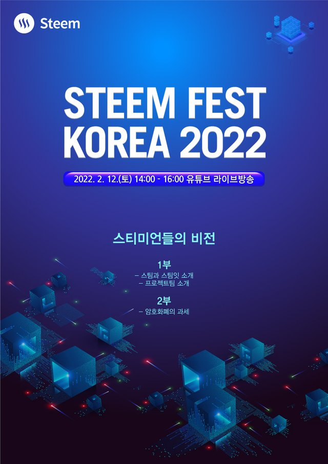 [2월 12일 토요일 14:00] 스팀페스트코리아 2022jstory (75)in SCT.암호화폐.Crypto • 4 years ago (edited) 스팀의 나아갈 방향과 비전에 대해 이야기를 들어볼 수 있는 "2022 STEEM FEST KOREA"가 2022. 2. 12.(토) 14:00 - 16:00 유튜브 라이브로 진행될 예정입니다. 행사명: 2022 STEEM FEST KOREA 주제: 스티미언들의 비전 일정: 2022. 2. 12.(토) 14:00 - 16:00 장소: 유튜브 라이브방송 참여 선물도 많다고 합니다~ #sct-kr #sct-freeboard #krsuccess #aaa #zzan #sct