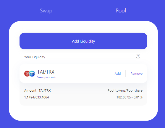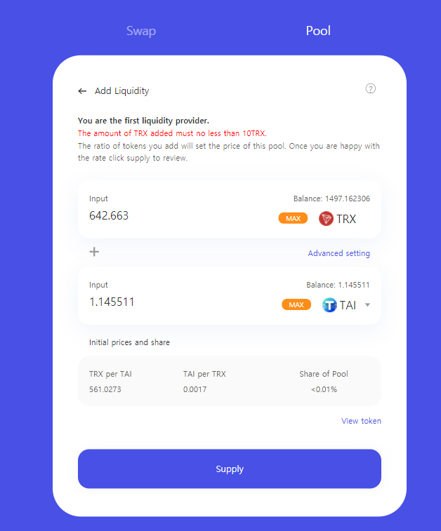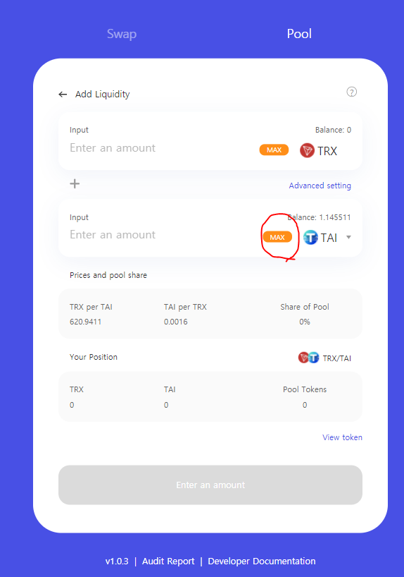우리는 여기서 TAI만큼의 트론을 쌍으로 공급해야하므로 TAI MAX를 선택하면 자동으로 트론숫자를 맞춰준다.