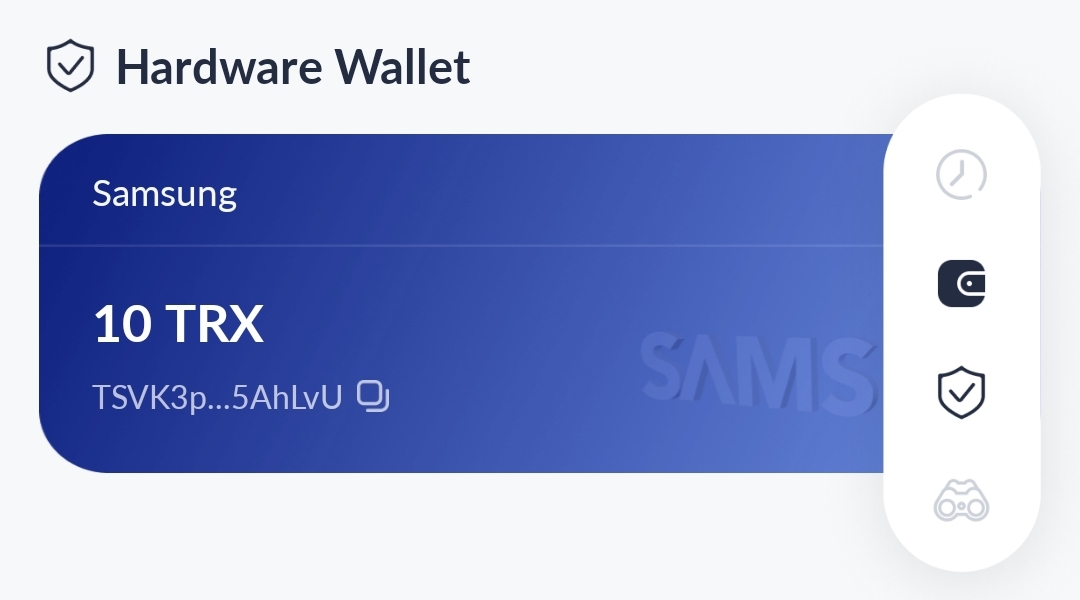 트론링크 모바일에서 삼성 블록체인 키스토어로 계정만들면 하드웨어 월렛으로 인식하네요.