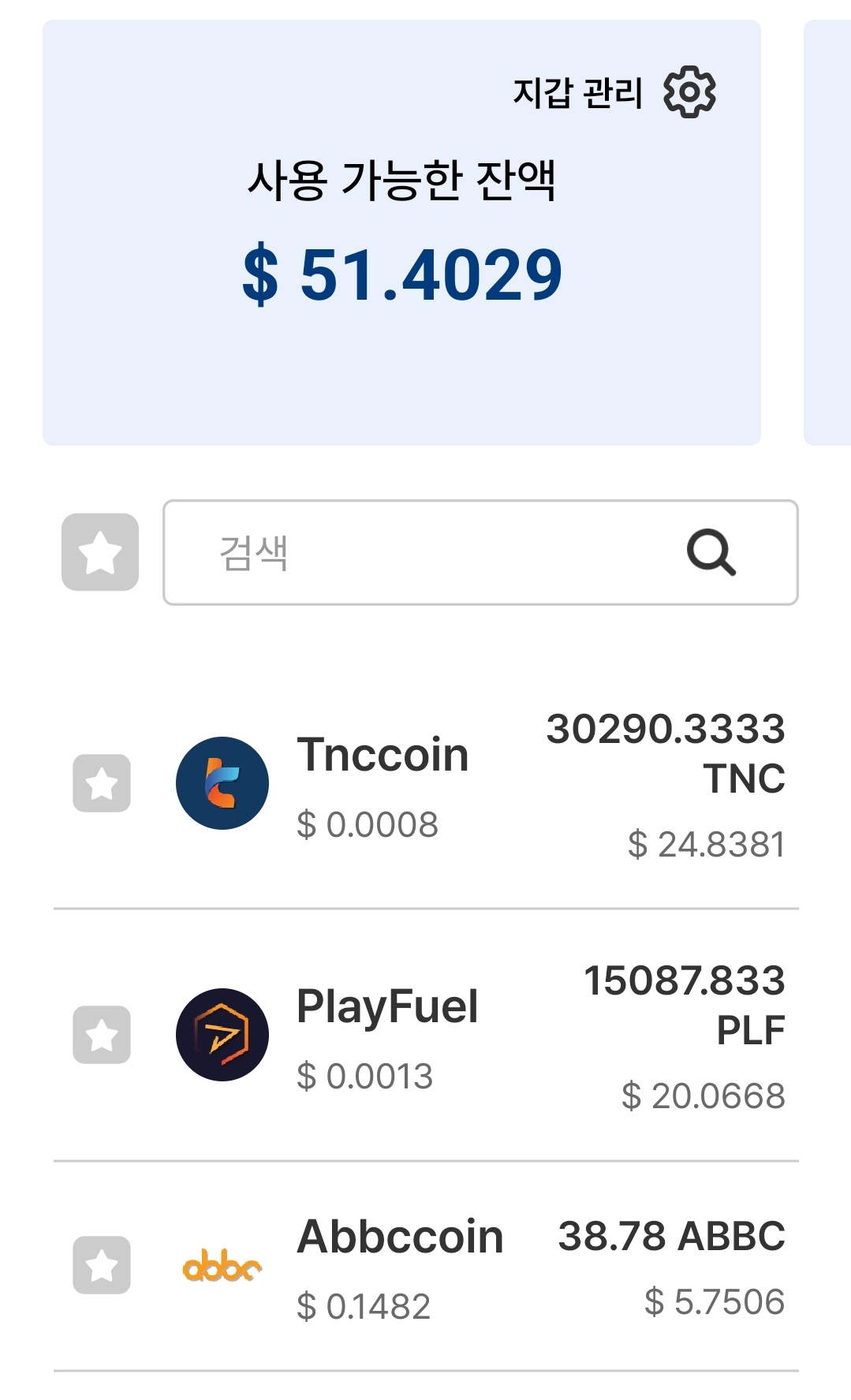 보다시피.. 지갑에 예로 Tnccoin, PlayFuel 코인을 받고 있는데
