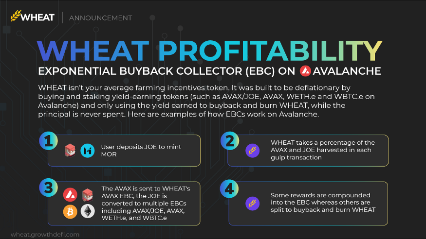 각각의 EBC는 스왑 피, 랜딩 소득, AVAX-JOE 이율 등을 통해 수익을 창출합니다. 리워드는 EBC안에서 컴파운딩되기도 하며 EBC에서 창출되는 이익은 WHEAT 바이백, 소각과 함께 WHEAT/AVAX, WHEAT/MOR LP 본드를 창출합니다.