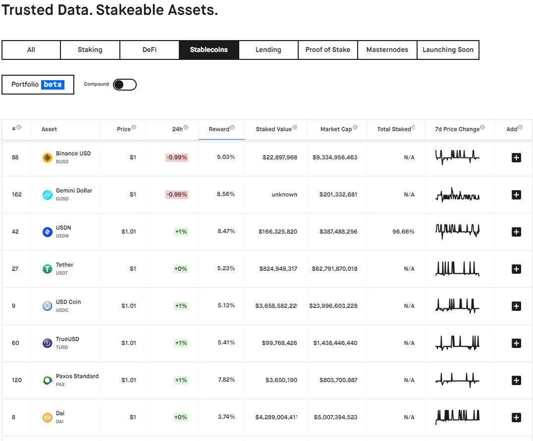 상단 우측의 메뉴를 통해 Crypto Assets을 들어가면 디파이, 스테이블코인, 랜딩, POS 등의 코인분야별로 스테이킹 데이터를 확인 할 수 있습니다. 현재 스테이블코인 중 가장높은 이율은 Gemini Dollar로 8.56%로 확인됩니다.