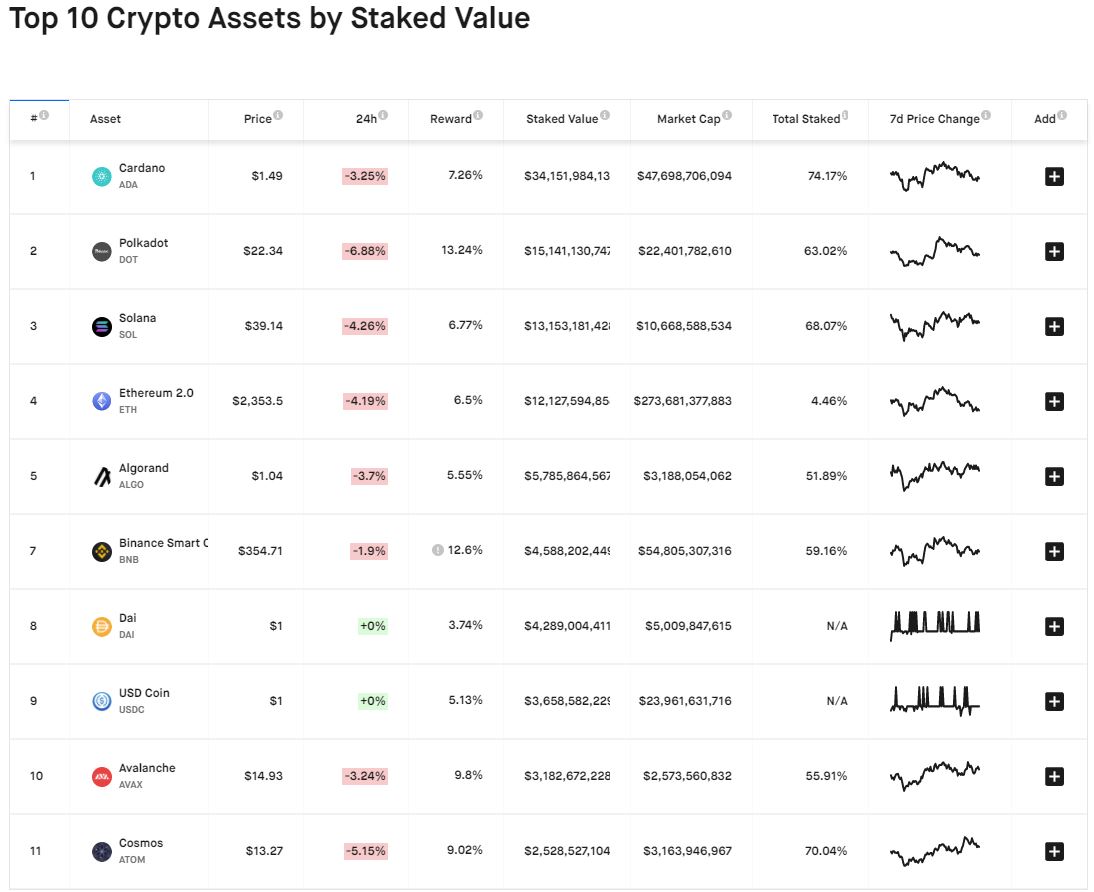 1위인 카르다노에이다의 스테이킹 비율은 무려 74%에 달합니다. 시장출회물량이 4분의1정도 밖에 안되는 셈 입니다. 이어서 2위인 폴카닷, 3위인 솔라나는 65%에 근접합니다. 카르다노와 폴카닷, 솔라나는 모두 플랫폼코인으로 시장에 많은 물량이 풀리지 않은 것 을 확인 할 수 있습니다.