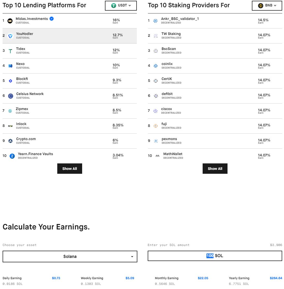 아래로 스크롤을 내리면 상위10위 랜딩 플랫폼과 스테이킹 제공자를 확인 할 수있습니다. 검색이 필요한 자산을 선택하면 해당하는 자산의 데이터가 보여집니다. 또한 하단에는 원하는 자산의 기본 이율을 바탕으로 얻을 수 있는 스테이킹 리워드 예측치를 보여줍니다.