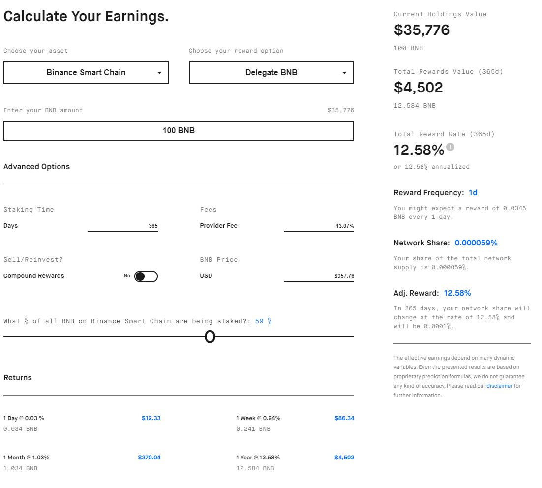 마지막으로 세번째 메뉴인 Calculator을 이용하면 여러 변수값들을 구체적으로 설정하여 예상 리워드를 확인 할 수 있습니다. 예를들어 100BNB를 delegate 방식으로 바이낸스 스마트 체인에 예치했을때 얻을 수 있는 APY는 12.58%로 확인되며 1년 후 125.845BNB로 증식됩니다.