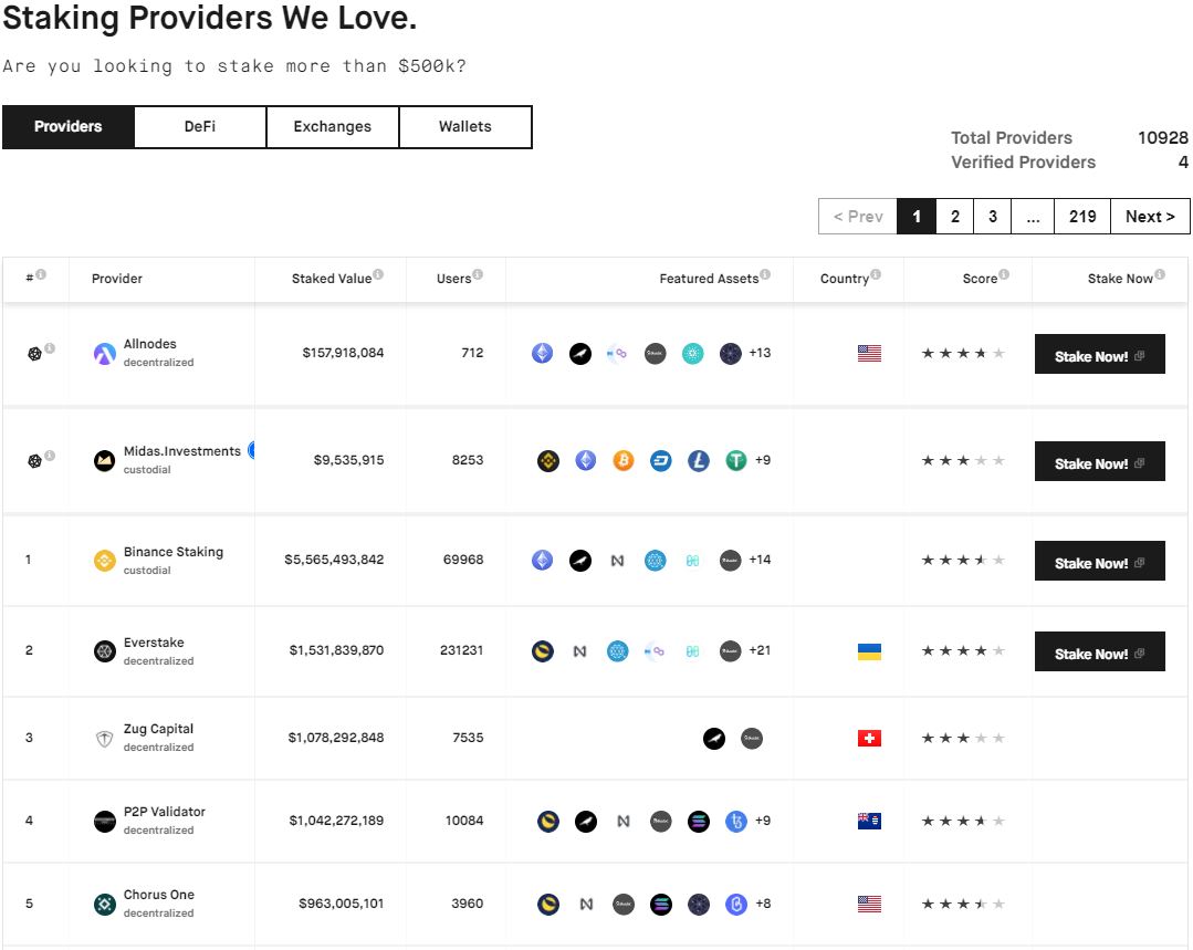 두번째 메뉴인 우측상단의 Staking Providers를 클릭하면 가장 많은 스테이킹 가치를 바탕으로 가장 많은 자금이 예치되어있는 랭킹에따라 스테이킹 제공 플랫폼을 확인 할 수 있습니다. 현재 1위는 바이낸스 스테이킹이며 55억달러에 달하는 금액의 코인이 스테이킹되어있습니다.