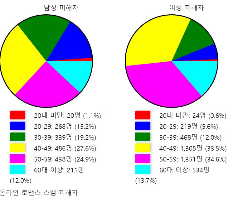 40대,50대, 60대이상이 주 피해자입니다. 외롭고 돈 많은 순진한 사람들을 노린듯합니다.