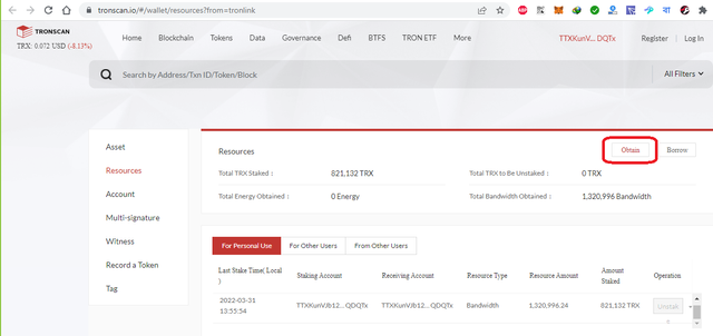 트론스캔이 열립니다. "얻기" 버튼을 클릭하십시오 -