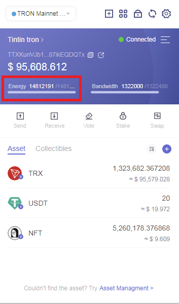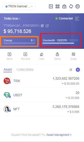 틴틴바부의 지갑은 대역폭이 넓어서 trx를 한번에 많은 사람에게 무료로 전송할 수 있습니다. 1322278 지금 대역폭 trx에서 총 5650개의 무료 트랜잭션을 수행할 수 있습니다. 단, 에너지가 0이기 때문에 trx 이외의 토큰을 전송하는 경우 수수료가 있습니다.