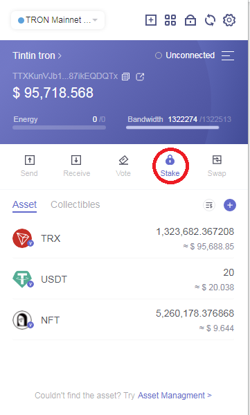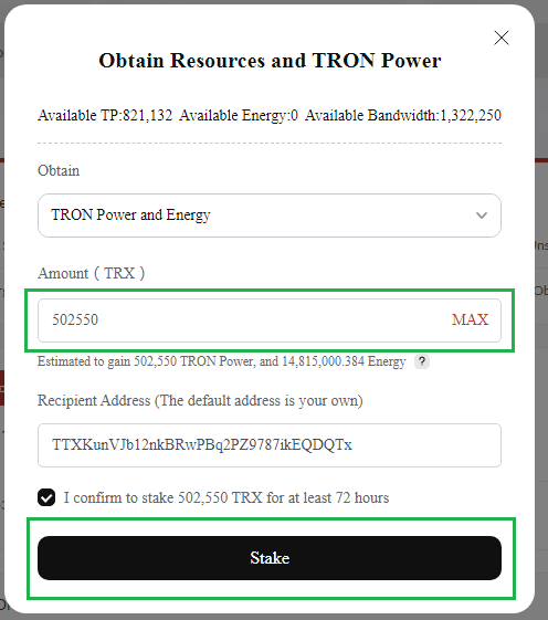 trx 스테이크 금액을 입력하고 "Stake" 버튼을 클릭하고 트랜잭션에 서명하십시오.