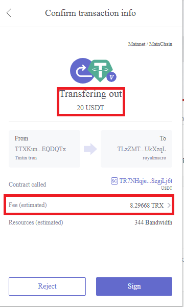 에너지가 0이기 때문에 20 usdt 전송 요금은 8.29 trx 수수료입니다.