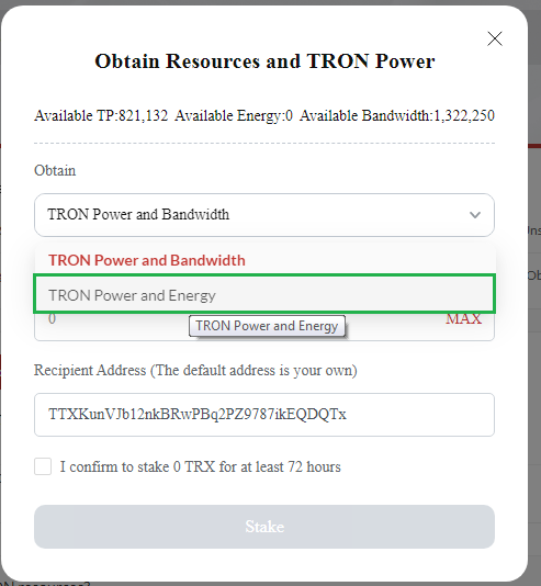 팝업 창이 열립니다. 대역폭을 원하면 "Tron Power & Bandwidth"를 클릭하고 에너지를 원하면 "Tron Power & Energy"를 클릭하십시오. 대역폭은 충분하지만 에너지가 없습니다. 따라서 "Tron Power & Energy"를 선택합니다.