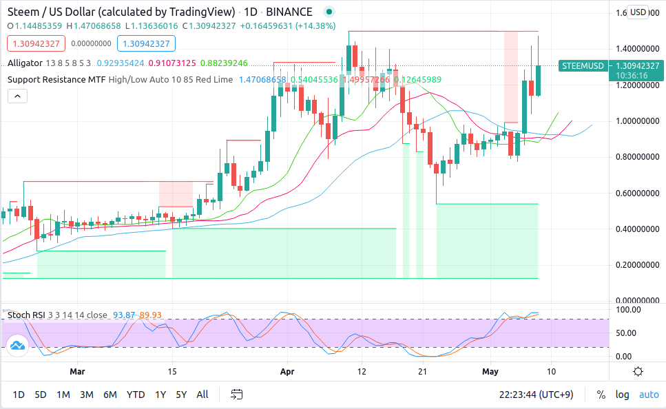 3月中旬まで、STEEMのアリゲーターは0.28ドル(30円)のサポートと0.66ドル(72円)のレジスタンスの間で眠っているように見えました。その後、かれは積極的に獲物を狩るために目を覚まし、4月10日に1.5ドル(163円)のレジスタンスまで登った。