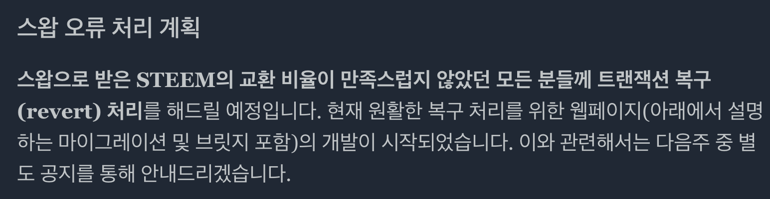 스팀코인판 스왑 재개 후 많은 트랜잭션이 동시다발적으로 몰리면서 위에서 설명한 문제들이 원인이 되어 스왑이 제대로 동작하지 않은 점에 대해서 다시 한 번 사과의 말씀을 올립니다.