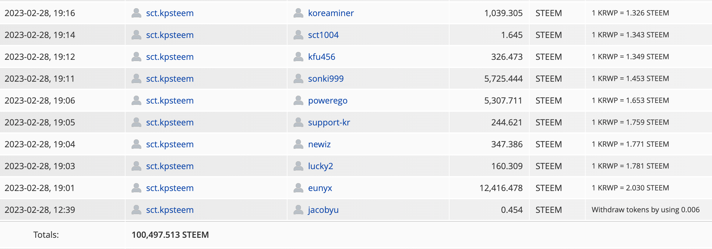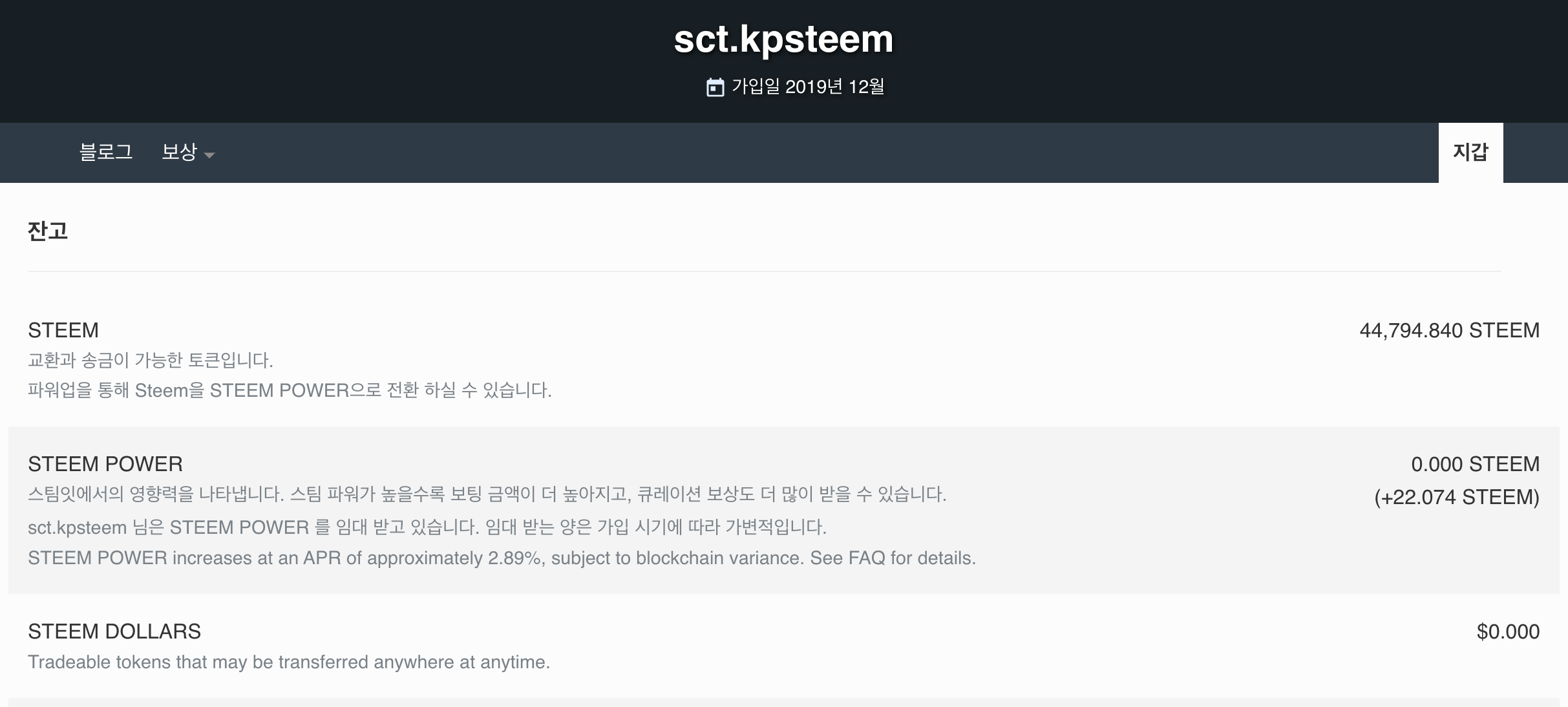 • 최종 청산 시에는 @sct.krwp 계정이 보유하고 있는 STEEM을 자신의 지분율만큼 클레임할 수 있습니다