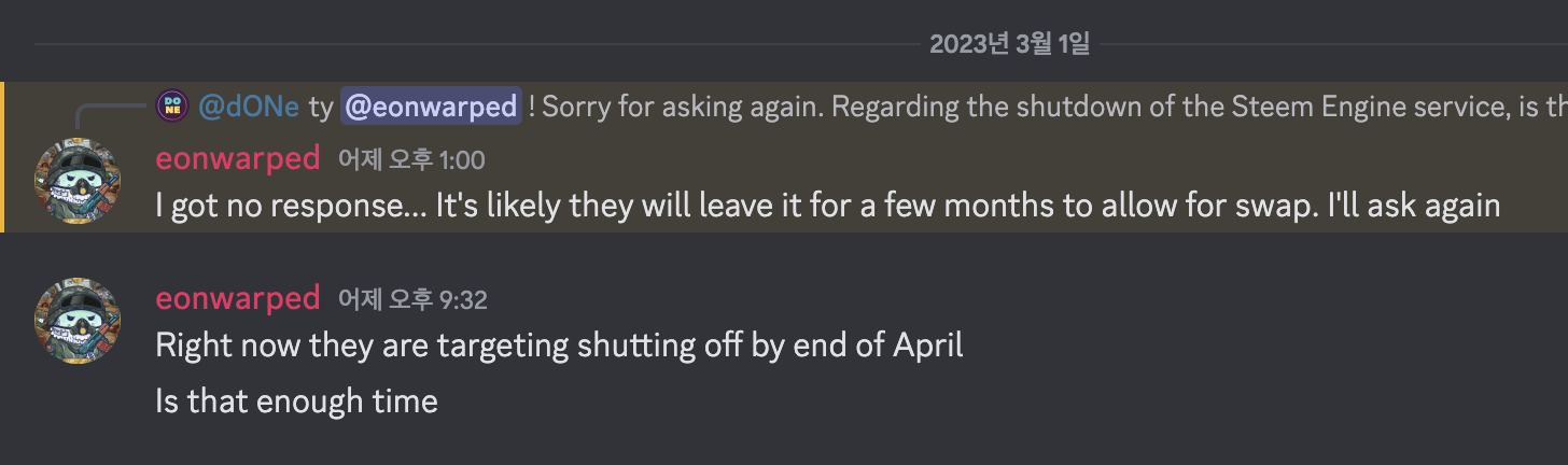 엔진팀에 지속적인 문의를 통해 답변을 받은 결과, 스팀엔진은 4월까지만 운영 후 서비스가 종료될 예정입니다. 더불어 이번 사태를 통해 스팀코인판 스왑 시스템은 사용자들이 믿고 사용할 수 있는 수준의 서비스가 아니라는 점을 알 수 있었습니다.