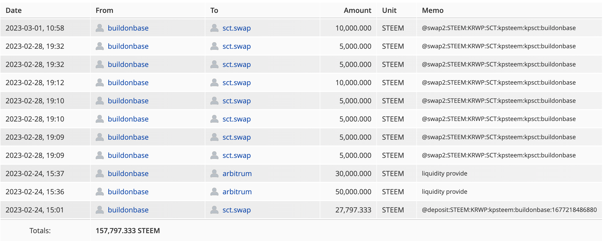 팀에서 유동성 공급을 충분히 하였는지, 그리고 가격하락을 막기 위한 매수를 진행했는지 여부는 온체인 기록을 통해 모두 투명하게 확인하실 수 있습니다. 팀의 유동성 공급 계정은 @sct.kpsteem, @buildonbase, @arbitrum까지 총 3개의 계정이며 스왑 시스템에 공급한 유동성 규모는 약 400,000 STEEM 입니다.