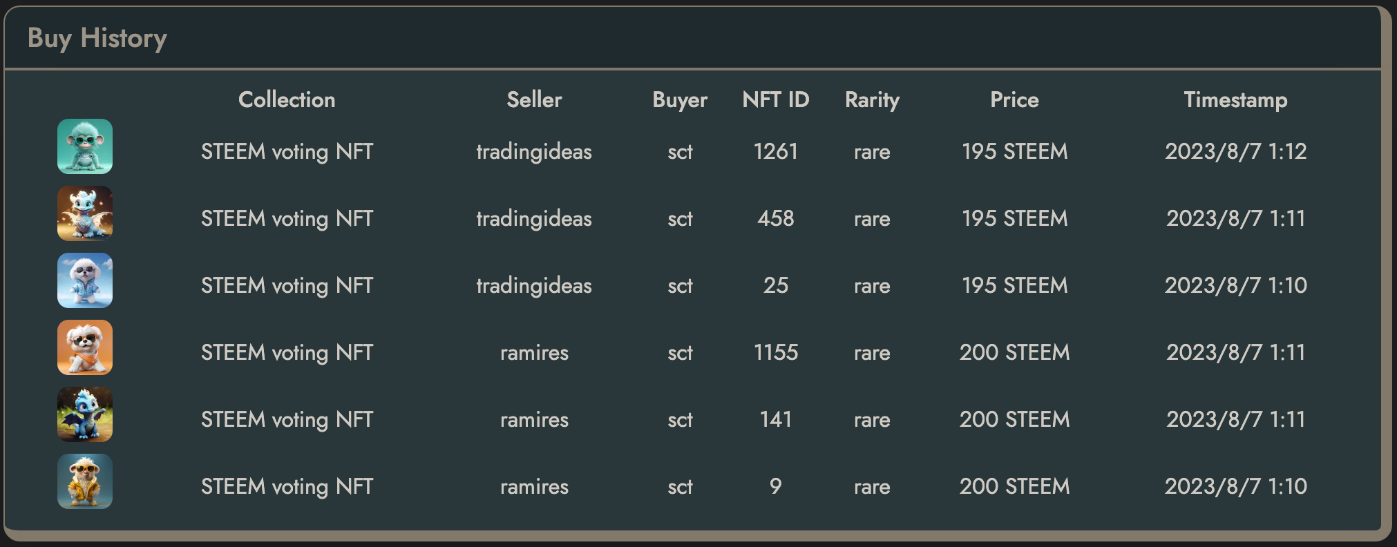 NFT의 바이백 및 소각은 일정 수량의 스팀파워가 적립되면, 파워다운 후에 바이백 및 소각하는 방식을 따릅니다. 혹시라도 NFT를 STEEM으로 현금화를 원하시는 분들은 스팀 스쿼드 NFT 마켓에 리스팅을 해놔주시면 됩니다. (1차 바이백의 경우에는 리스팅되어 있는 수량이 많지 않아 총 6개만 바이백 후 소각되었습니다)