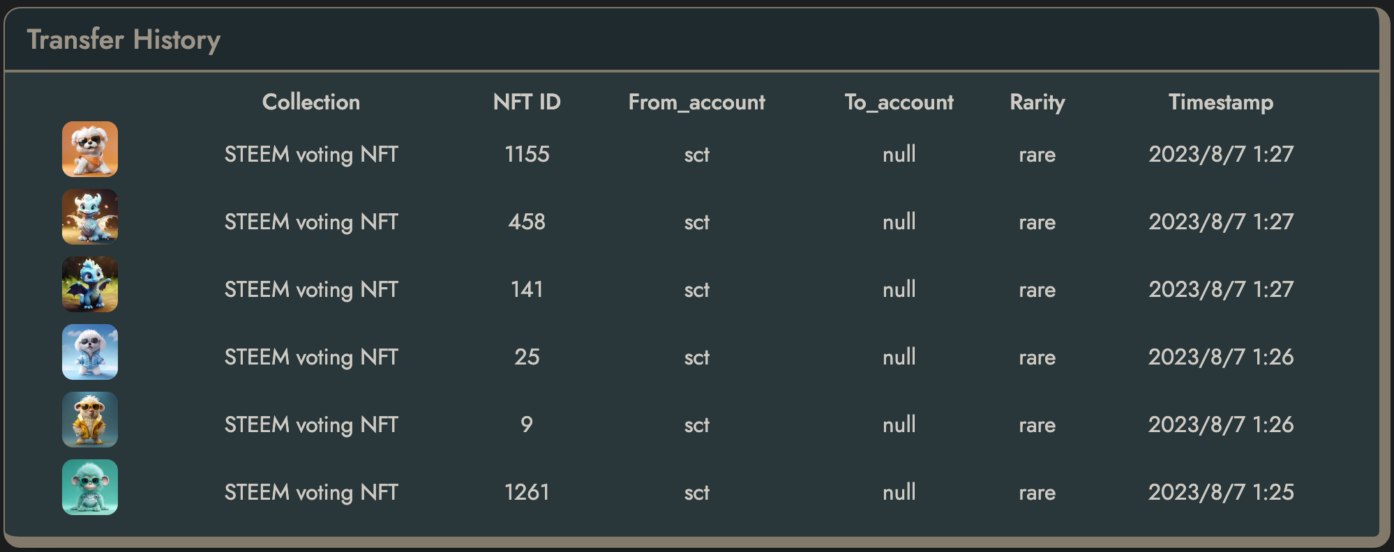 • 해당 NFT들은 모두 @null 계정으로 전송하여 소각처리되었습니다