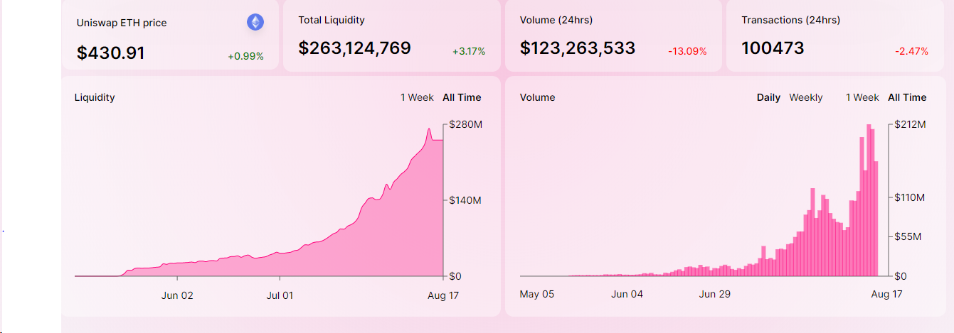 실제로 AMM DEX 시스템 중 대표 플랫폼 Uniswap의 마켓 볼륨과 풀 사이즈는 최근 몇달간 폭발적으로 성장했습니다. DeFi 관련 코인들이 블록체인 시장에 왜 거대한 폭풍을 몰고 왔는지 이 성장세를 보면 이해가 되기도 합니다. Uniswap의 24시간 볼륨은 현재 중앙화 거래소와 비교될 정도로 성장했는데요. Coingecko 기준으로 Uniswap의 볼륨은 1억 6천만 달러로 1위 거래소 binance의 볼륨 40억 달러에 비하면 4%수준에 불과하지만, 한국 거래소 빗썸/업비트 볼륨 4억 달러에 비해만 무려 ~30%까지 성장한 것입니다. 전세계로 따져도 무려 28위에 해당되는 볼륨이고, 비슷한 볼륨 수준의 거래소로는 코인빗과 Bitfinex가 있습니다. 실감이 되시나요?