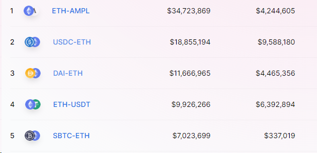 재미있게도 1위는 ETH-AMPL 페어링 풀입니다. 이에 대한 이야기는 다음 글에서 다뤄보겠습니다.