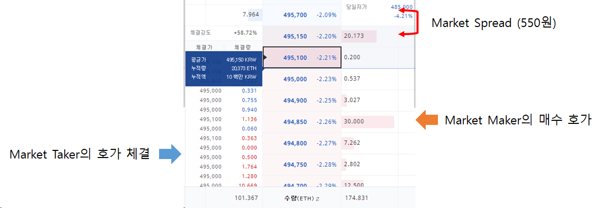 업비트의 호가창입니다. 캡처한 창의 market spread는 550원이군요. 이 spread는 좁을 수록 이용자에게 좋겠죠. spread가 좁아지는 것을 유도하기 위해 maker의 fee를 내려주는 방법을 보통 사용합니다. 큰 유동성 확보가 필요하다면 maker에게 오히려 프리미엄을 주는 형태의 마켓(bitmex)도 있습니다.