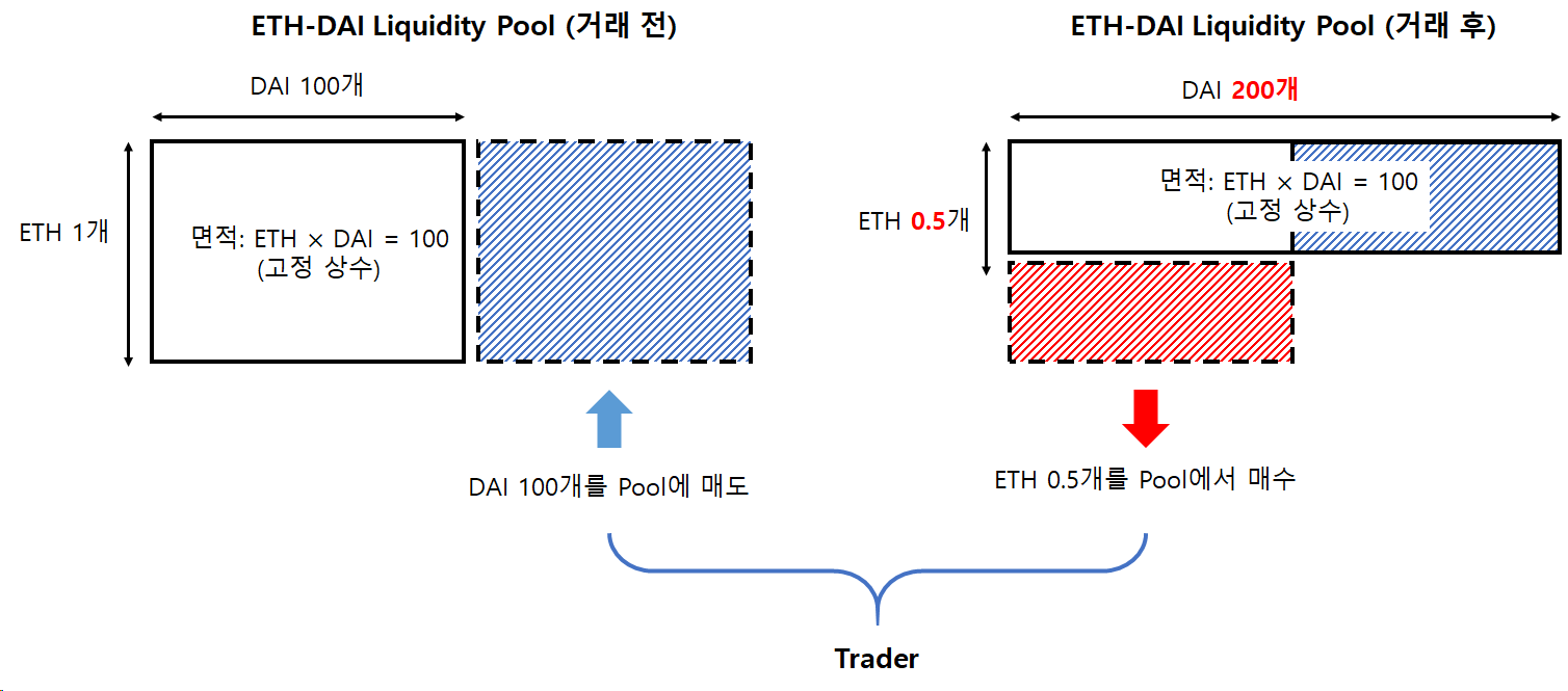한 트레이더가 이 Pool의 유동성을 이용해서 DAI 100개로 ETH를 사려고 합니다. 이는 Pool에게 DAI를 판매하는 것이므로, 일단 DAI 100개가 Pool으로 들어가는 것은 확정입니다. 그럼 거래 후로 Pool안에는 DAI 200개가 남게 될 것입니다. 앞서 말했듯, 두 코인의 갯수 곱은 거래 전/후로 일정하도록 설계되었습니다. 그러기 위해 Pool에는 100/200=0.5 개의 ETH가 남아 있어야합니다. 곧, 트레이더는 100개의 DAI를 지불하고 0.5개의 ETH을 Pool에게 받는다는 이야기가 되는 것이죠.