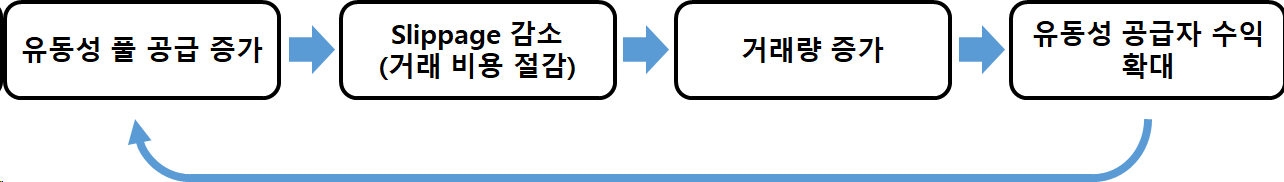 AMM을 활용한 DEX 시스템은 건강한 양성 피드백 구조를 갖습니다. 유동성 풀의 공급이 증가하면 slippage가 줄어들고, 한번에 교환할 수 있는 토큰 양이 늘면, 트랜젝션 1회의 수수료가 상대적으로 절감됩니다. 사용성과 효율성이 증대되어 거래량이 증가하면 유동성 공급자의 수익이 확대되는 것이므로, 이는 다시 유동성 풀 공급 증가의 유인이 됩니다. 이러한 양성 피드백 구조는 한번 작동하기 시작하면 폭발적인 성장을 할 수 있습니다. 또 이 구조는 실질적인 가치 창출(slippage 감소 및 토큰 스왑 수요 해소)을 한 것이기 때문에 나름 건강하다고도 볼 수 있겠습니다.