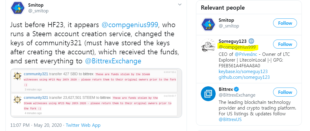 결론을 얘기하자면 밤 11시 HF23 코드가 작동됨과 동시에 악의적 계정들로부터 자산을 압류하여 재단이 새로 만든 @community321 계정의 지갑으로 모았는데 하포 직후 이 계정에 모인 2300만여 스팀이 해커에 의해 비트렉스 거래소로 이체된 사건입니다.