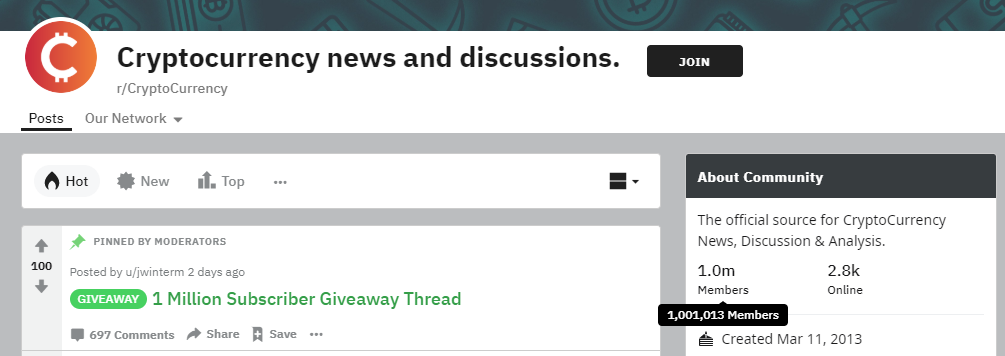 미국 소셜 뉴스 사이트인 레딧(Reddit)의 암호화화폐 커뮤니티 Cryptocurrency를 구독한 멤버수가 1백만을 돌파 했다