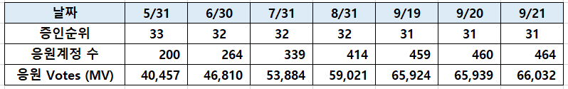 증인투표 응원을 적극 홍보 예정입니다. 보팅파워 가치가 오르면 kr 커뮤니티에 더 많은 응원이 가능합니다..