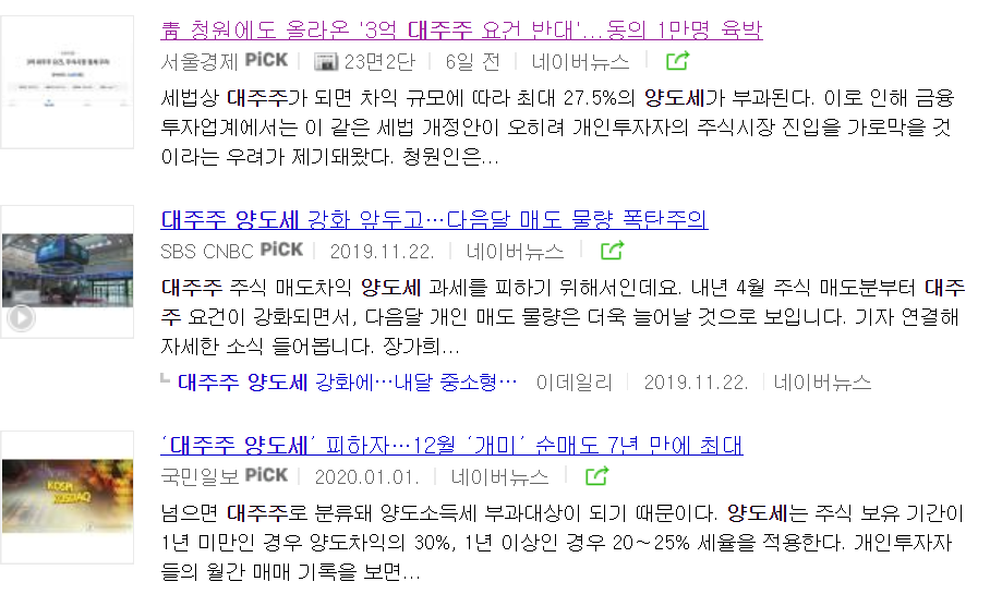 현재는 주식보유금액이 15억원이 넘으면 대주주로 간주하고 차액에 대하여 27.5%의 양도소득세를 부과하고 있습니다. 이것이 올해 4월 부터는 10억원, 2021년 4월부터는 3억원으로 기준이 줄어듭니다. 대주주의 기준이 단순히 연말에 보유한 금액의 합에 대하여 과세를 하다보니, 연말에 주식을 파는 수요가 증가하여 주식시장의 변동성을 키우는 요인이 된다고 합니다. 현재 기준으로도 연말에 매도 수요가 많다고 하는데, 이게 3억으로 줄면 변동성이 정말 클 것 같습니다.