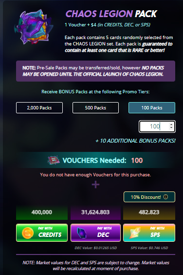 이제 본 계정에서 카오스 팩 100개를 사봅니다. 바우처가 부족하여 hive-engine에서 부족분을 구매하였습니다.