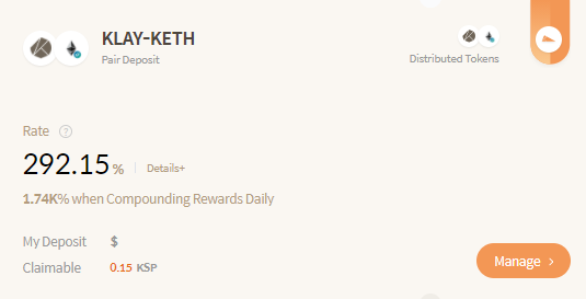 klay에서는 Klay-keth에 담굴 예정입니다. 그 이유는 eth를 장기 보유하고 있는데, 기왕이면 수익률이 높은 LP에 담궈놓기 위합니다. bsc defi에서는 이 정도 수익률이 나오는 쌍이 없습니다.