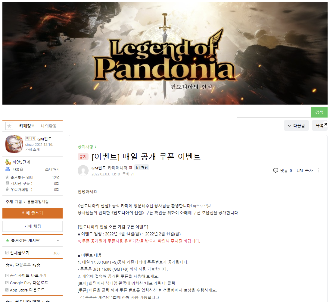 판도니아의 전설 공식 카페를 가보았습니다.