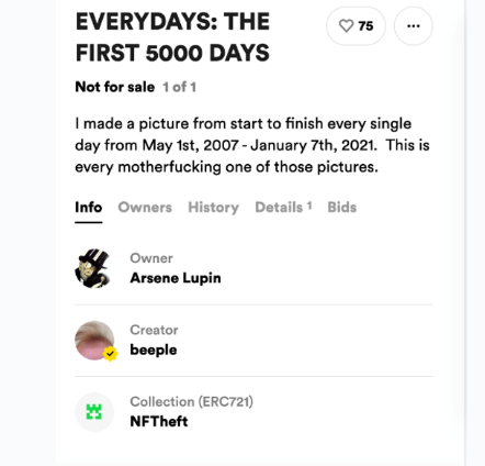 But he didn't stop there. Mr. Nobody then sent the copied NFT back to his own electronic wallet before sending it to a second accomplice calling himself by the name of Maurice Leblanc's famous thief: Arsène Lupin . The copied NFT was then deposited on a specialized exchange platform. What was the amazement of the community to see Beeple's work on sale a second time.