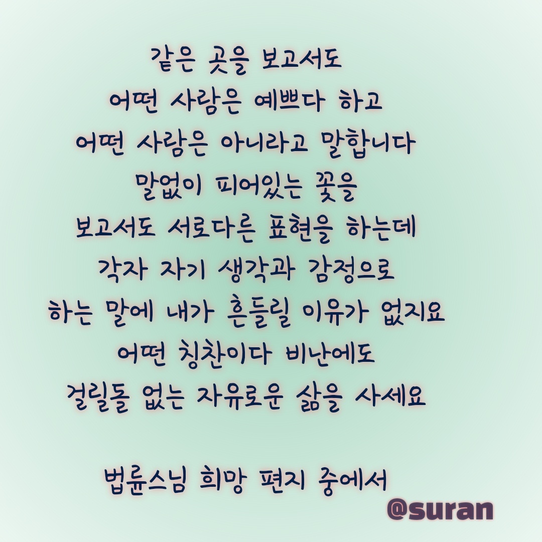 범륜 스님의 희망편지 중에서suran (57)in #sct-kr • 5 years ago 안녕하세요 @suran입니다 가끔 다른 사람의 말에 상처 받기도 하고 화가 나기도 하는 경우가 많잖아요 예전에 비하면 많이 유해지는듯 합니다 어떤말에도 자유로와 지자구요 나머지 오후도 즐겁고 행복하이소 #sct-freeboard #sct #dblog #zzan #aaa #newbie