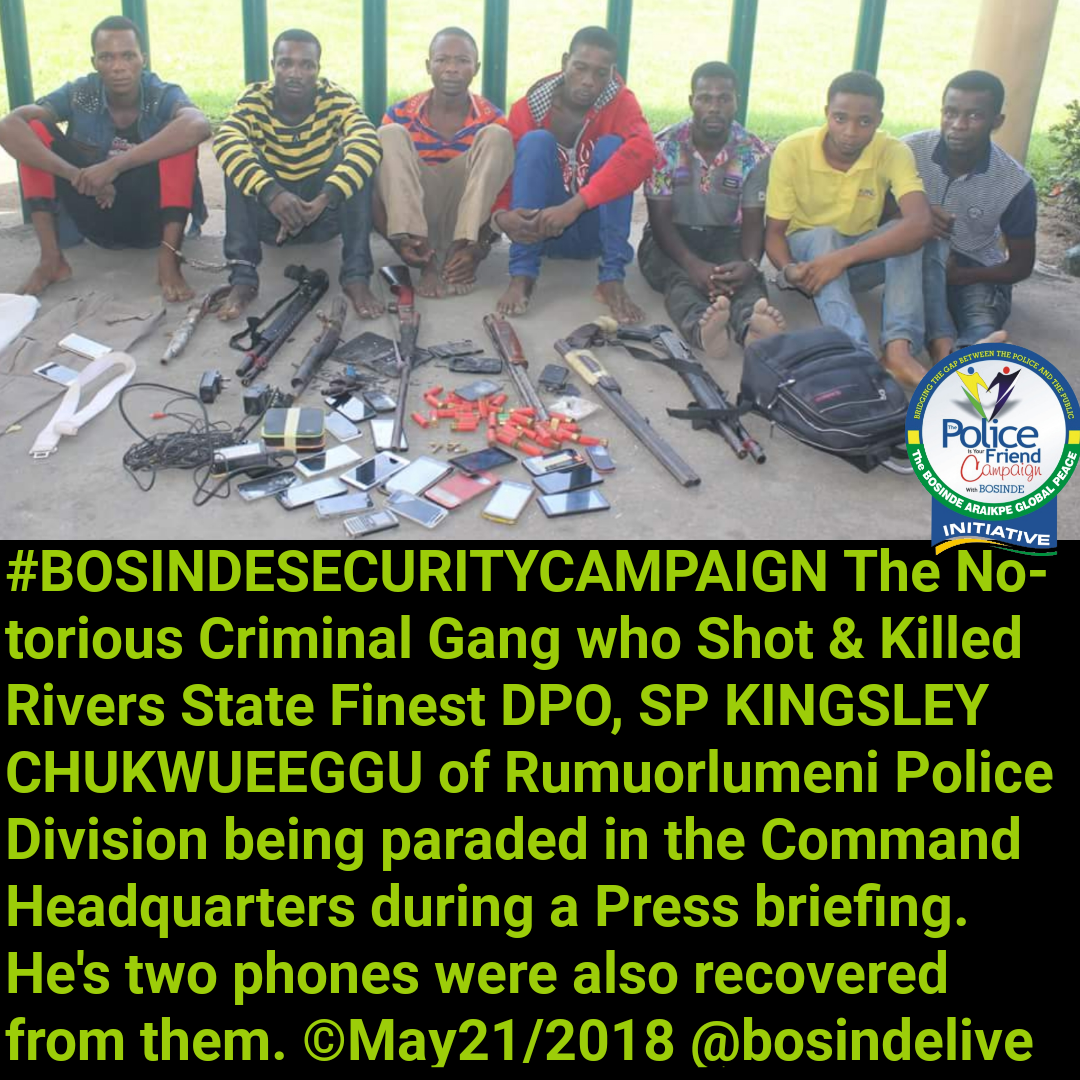IMG_20180522_134450_472.jpgAs the Rivers State Police Command ably Commanded by CP ZAKI M. AHMED & the family of late SP KINGSLEY CHUKWUEEGGU concludes plans for the burial of late SP KINGSLEY CHUKWUEEGGU on Saturday 2nd of June 2018, the Command through the IGP Monitoring Unit led by ACP BEN IGWEH has arrested the Notorious Criminal Gang who Shot & Killed the Police SPO during a robbery Operation.sketch-1526991600310.png