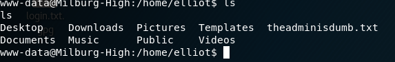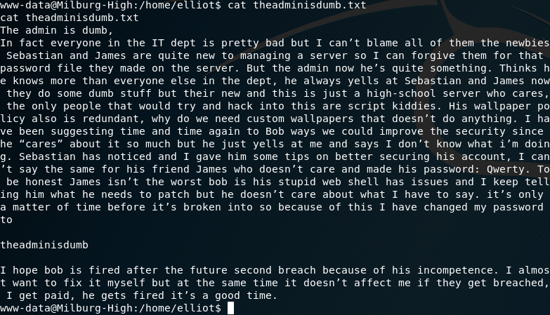 The only thing of interest is the file seen above called theadminisdumb.txt - there wasn't anything else of value in his home directory. That being said, here is the contents of the file: