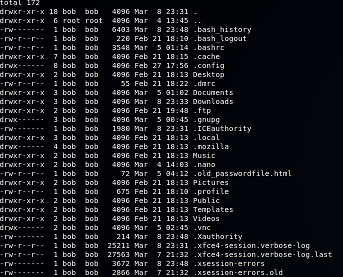 Taking a look at Bob's directory we see a "hidden" html file called old_passwordfile.html