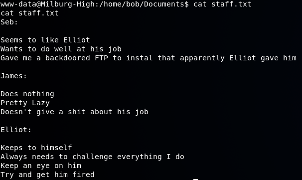 Further searching into Bob's home folder, we find something in his Documents: