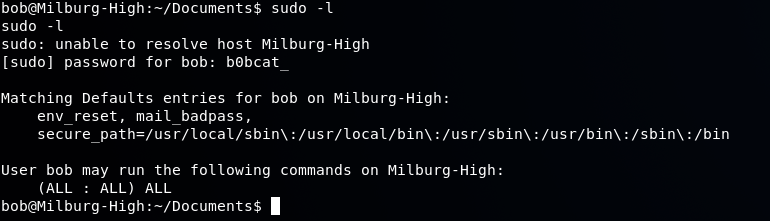 So just to make sure, we perform a sudo -l to see if bob has root access or commands he can use: