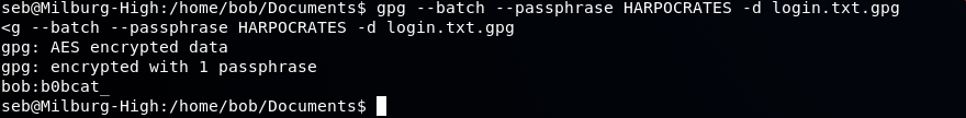 Using the following command on the system itself: gpg --batch --passphrase HARPOCRATES -d login.txt.gpg
