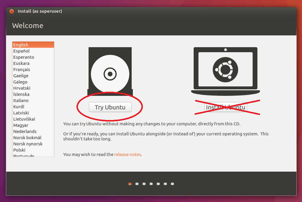 Shut down the computer you want to create the keys on. Insert the bootable USB stick and start it up. Do not install Ubuntu, simply choose 'Try Ubuntu'. This should take a moment and then show you a nice clean Ubuntu desktop.