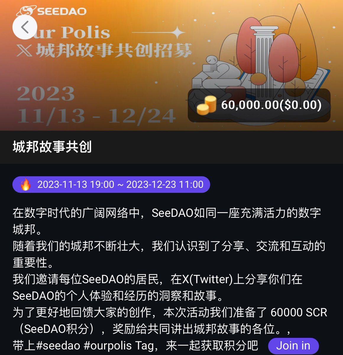 为了更好地回馈大家的创作,本次活动我们准备了 60000 SCR(SeeDAO积分),奖励给共同讲出城邦故事的各位